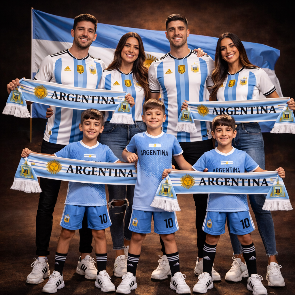 Este kit tribo captura a essência da Seleção Argentina para famílias grandes ou grupos de amigos. Vistam as camisolas, enrolem os cachecóis, ponham os equipamentos nos mais pequenos e hasteiem a bandeira juntos – sintam que estão unidos como uma verdadeira tribo de torcedores. No estádio em multidão, no churrasco a vibrar ou em casa a torcer pelo próximo golo histórico. Porque apoiar Argentina não é só cultura… é uma emoção coletiva que une o pessoal todo e dura para sempre.